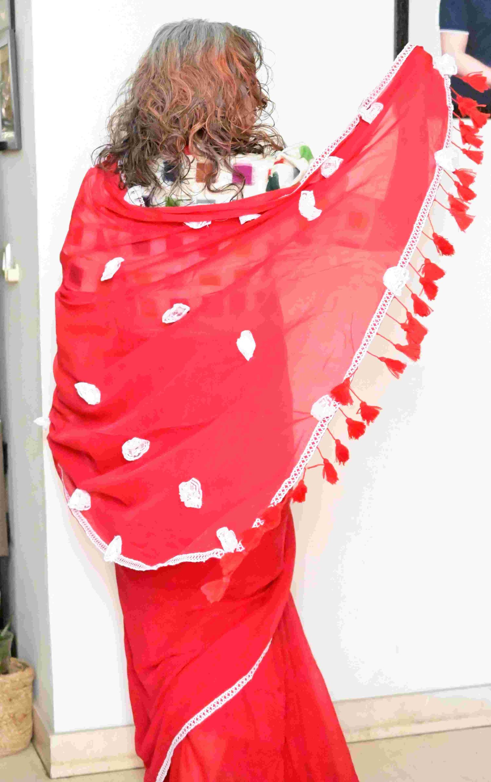 Elegant and timeless, our Red Mul saree features a striking white flower pattern on the pallu and delicate lace and tassels. This classic monochrome design exudes sophistication and versatility, making it a perfect choice for any occasion. Embrace the understated charm of this saree, a fusion of tradition and contemporary style.