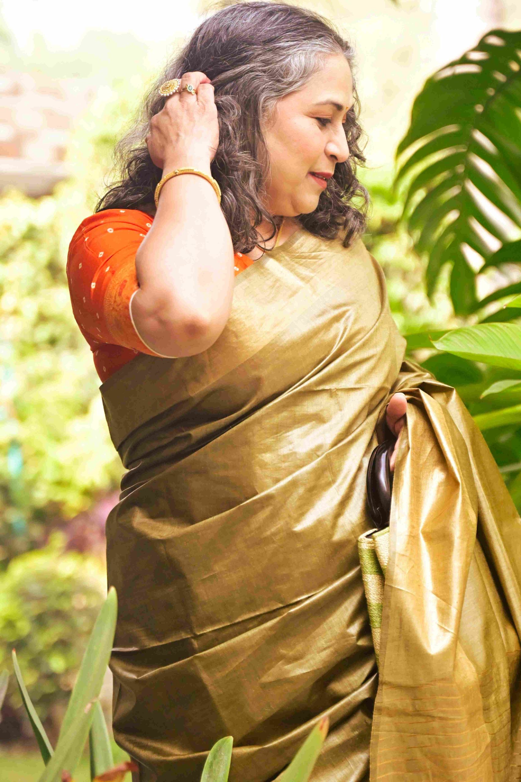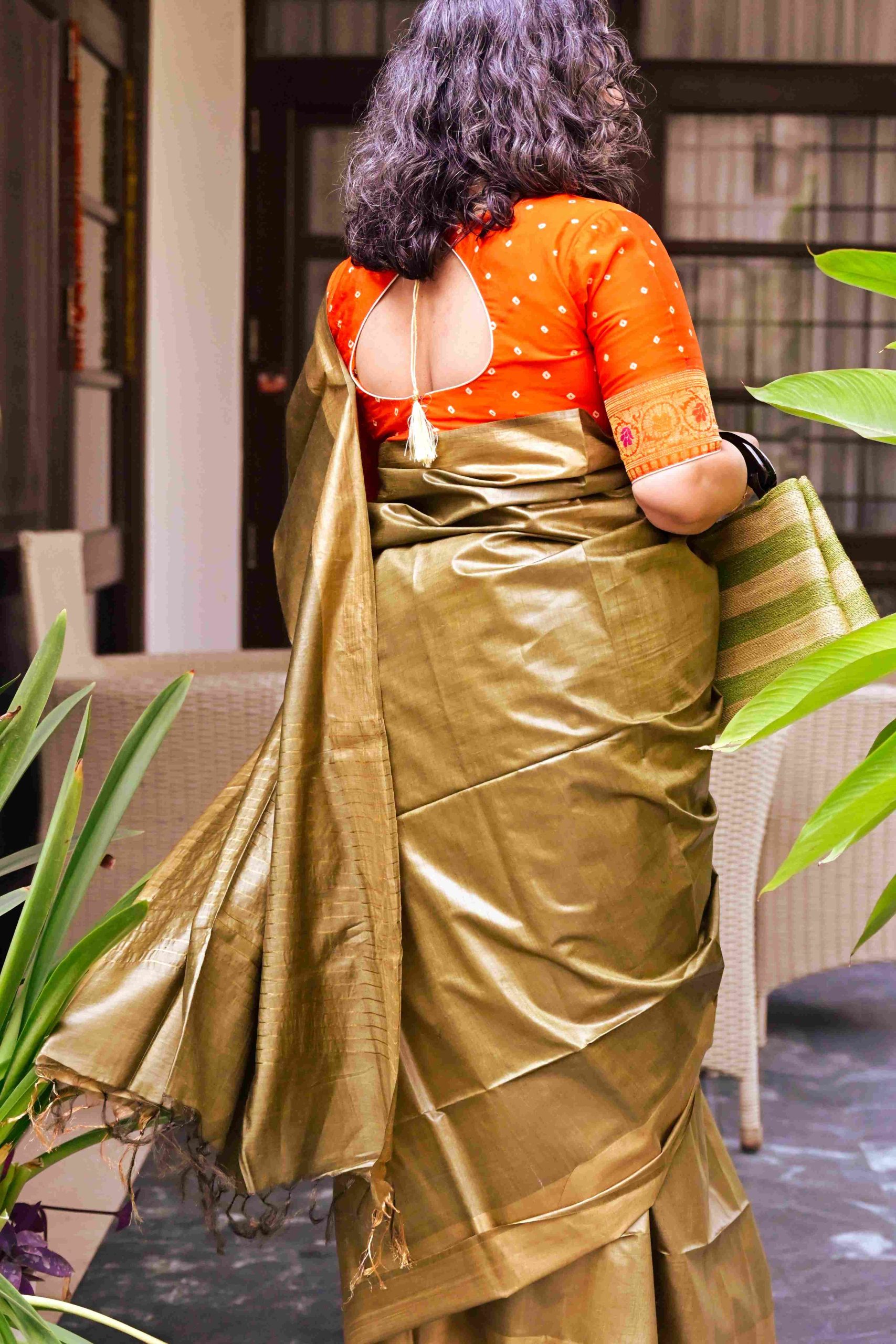Elevate your style with a stunning Beige green tussar saree featuring elegant zari accents. Crafted from luxurious tussar silk, this saree offers a perfect blend of tradition and contemporary fashion. The subtle color adds an elegant, festive touch, while intricate zari borders provide a touch of opulence and grace. Ideal for weddings, festivals, and special events, this tussar saree showcases artisanal craftsmanship and timeless elegance. Eco-friendly and comfortable, the tussar fabric drapes beautifully, making it a must-have for women seeking a blend of style and sustainability.